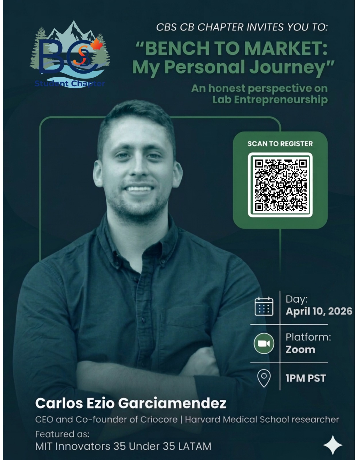 The BC Student Chapter of the Canadian Biomaterials Society (CBS) is pleased to host a webinar this Friday, April 10th at 1pm PST. This Zoom webinar is titled "Bench to Market: My Personal Journey" and will be presented by Carlos Ezio Garciamendez, CEO and Co-founder of Criocare and Harvard Medical School researcher.