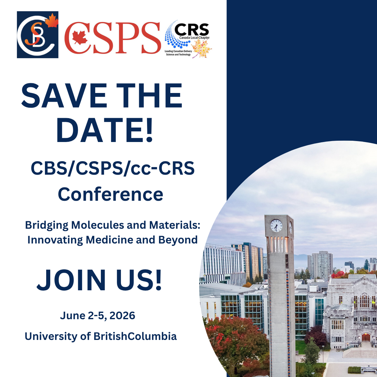 Overview The Canadian Biomaterials Society CBS , the Canadian Society for Pharmaceutical Sciences CSPS , and the Controlled Release Society cc-CRS are joining forces to host a landmark joint conference at UBC Vancouver...